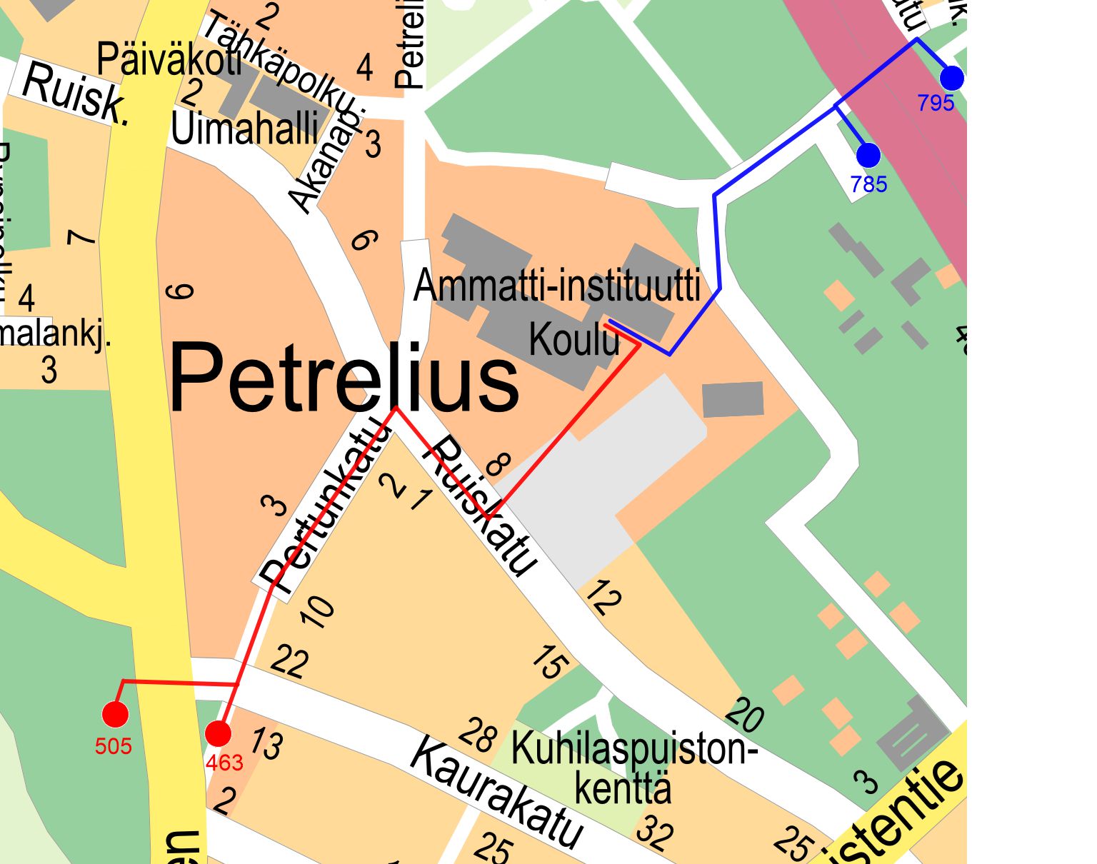 Pysäkeiltä 505 ja 785 jatkat edelleen kävellen (punaisella ja sinisellä) merkittyä reittiä kohti sisäänkäyntiä C. Takaisin keskustaan pääset vastaavasti pysäkeiltä 463 (Kaurakatu) ja 795 (Vanha Hautausmaa), jotka sijaitsevat suunnilleen vastakkaisella puolella tietä pysäkeistä 505 (Kaurakatu) ja 785 (Vanha Hautausmaa). Parhaimmillaan bussit kulkevat 5-10 minuutin välein; joskin ilta-aikoina kannattaa varautua hieman harvempaan liikennöintiin. Tarkemmin linja-autoyhteyksiin voit tutustua Turun seudun joukkoliikenteen sivuilta Föli.fi.